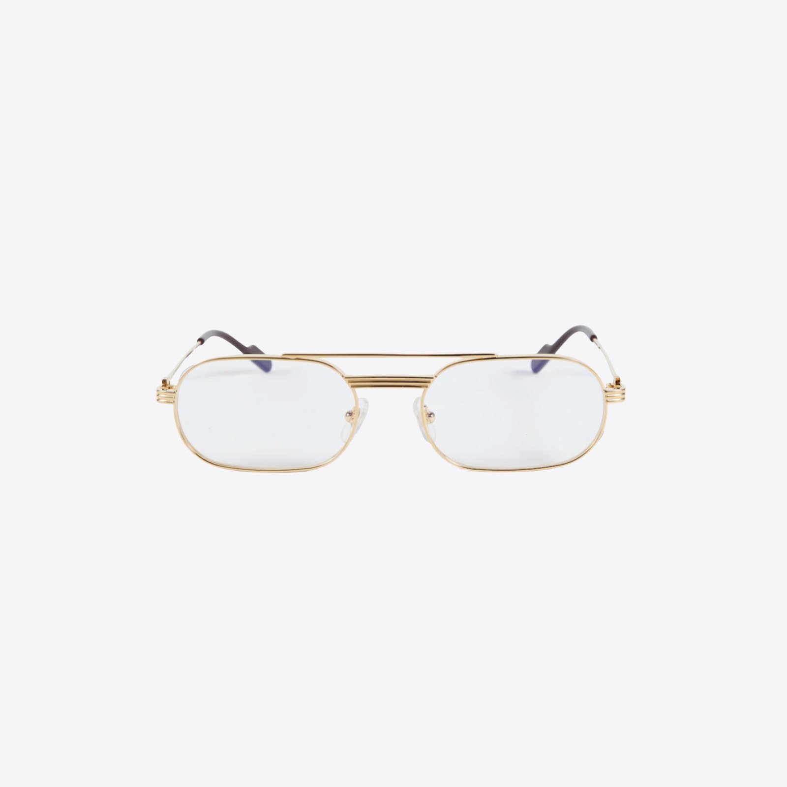 Moderna reinterpretación de la histórica forma rectangular con estructura de doble puente combinada con las emblemáticas varillas Première. Emblemática combinación del motivo Godron y los detalles de la C de Cartier como elemento estético y funcional de la bisagra. Acabado precioso de oro y platino, y placa con logotipo Cartier en los terminales inspirada en el estilo retro.